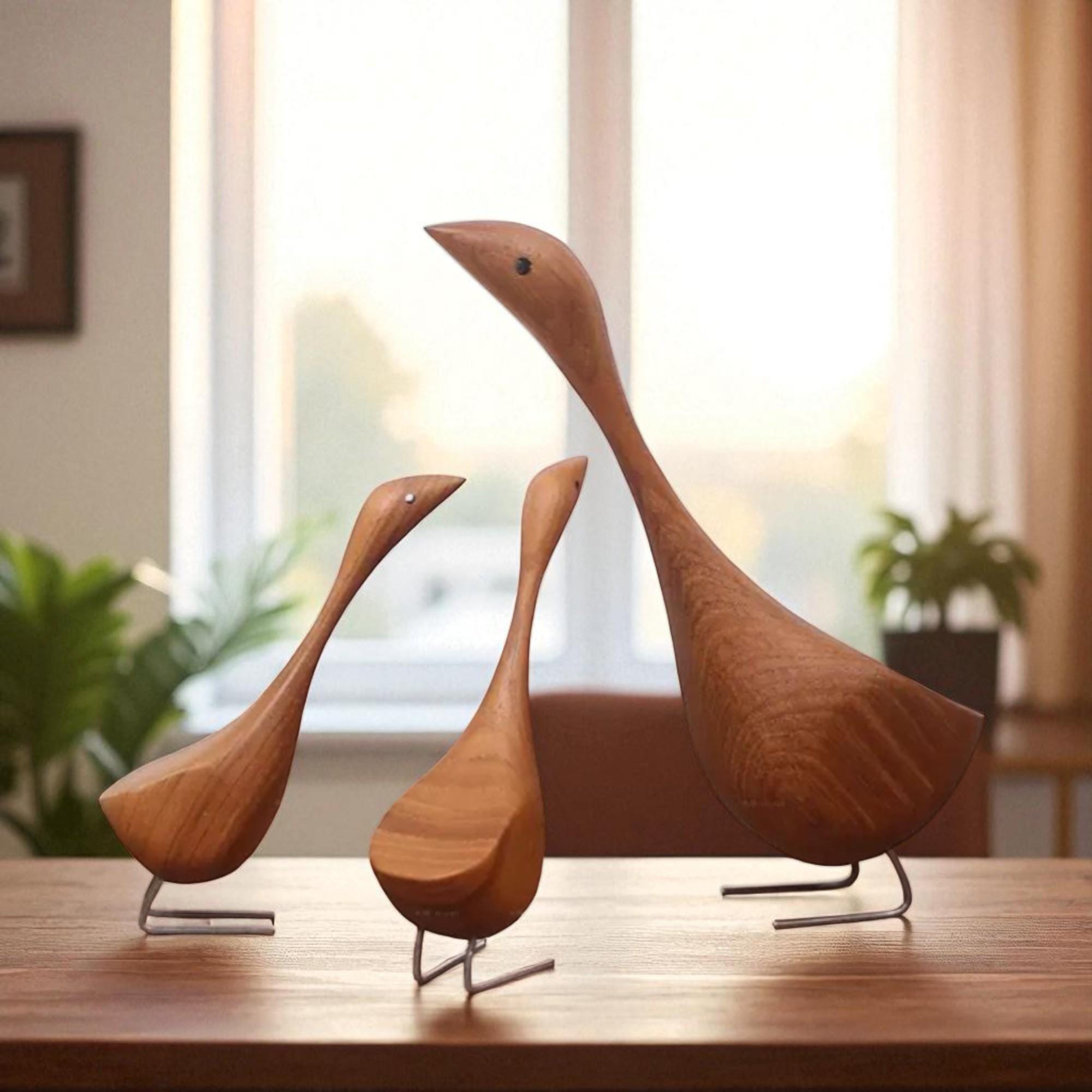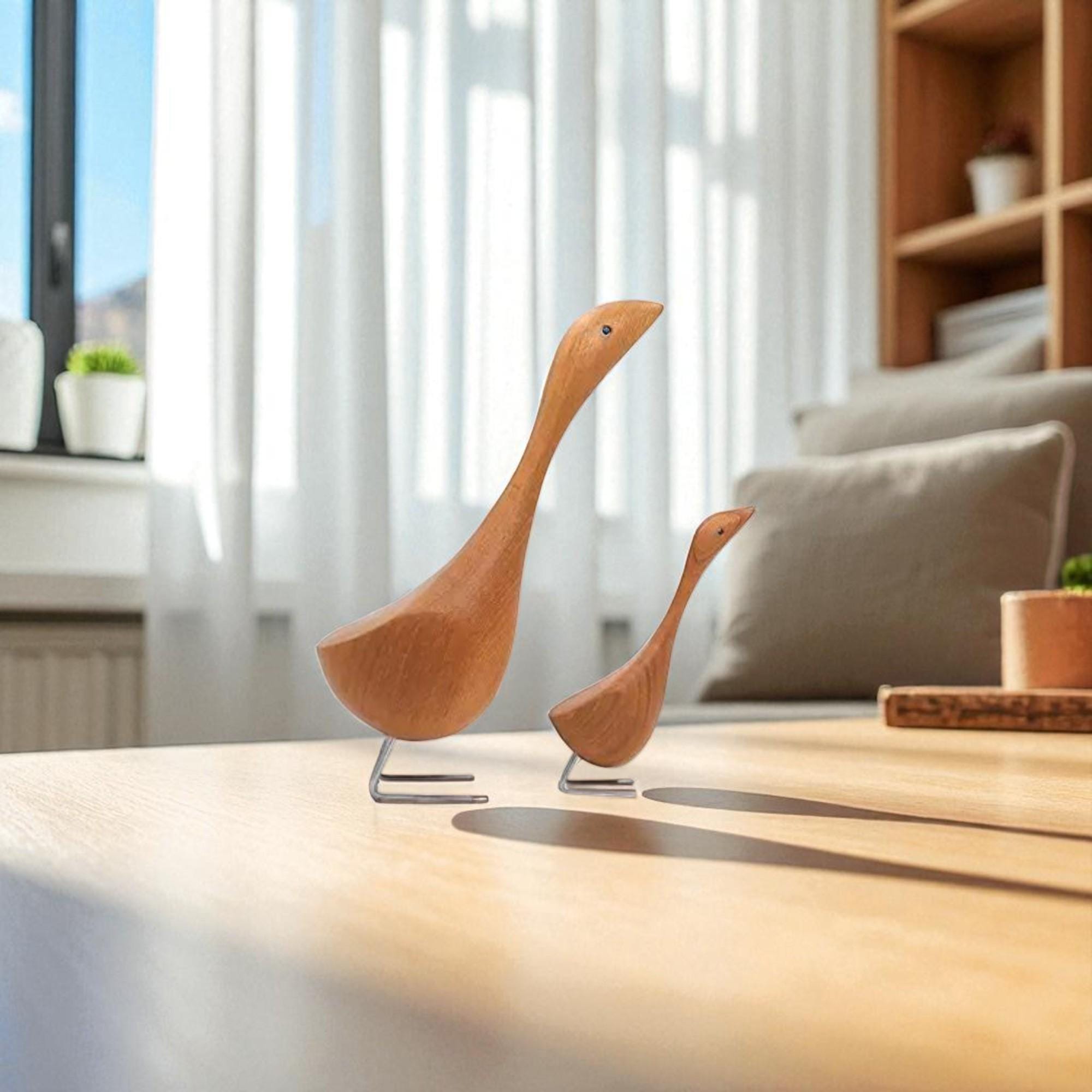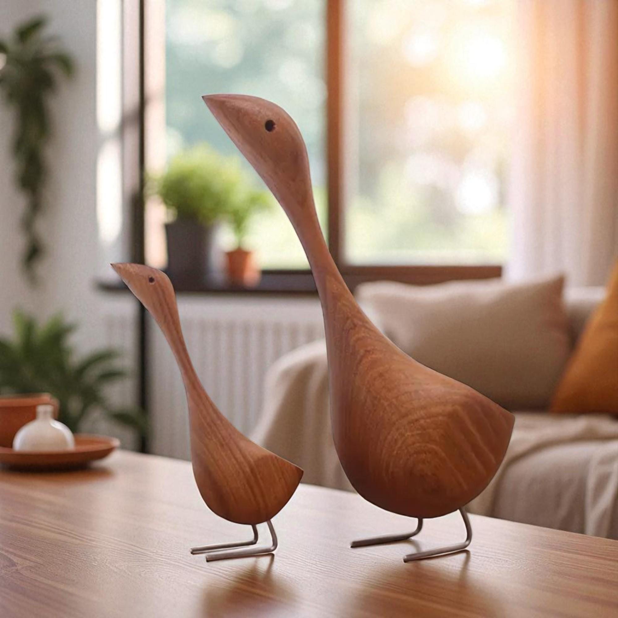 Handcrafted Teak Wooden Goose Sculpture Set – Scandinavian Minimalist Bird Decor, Set of 2