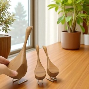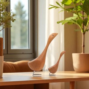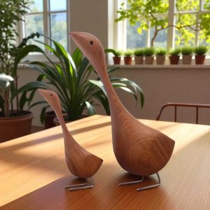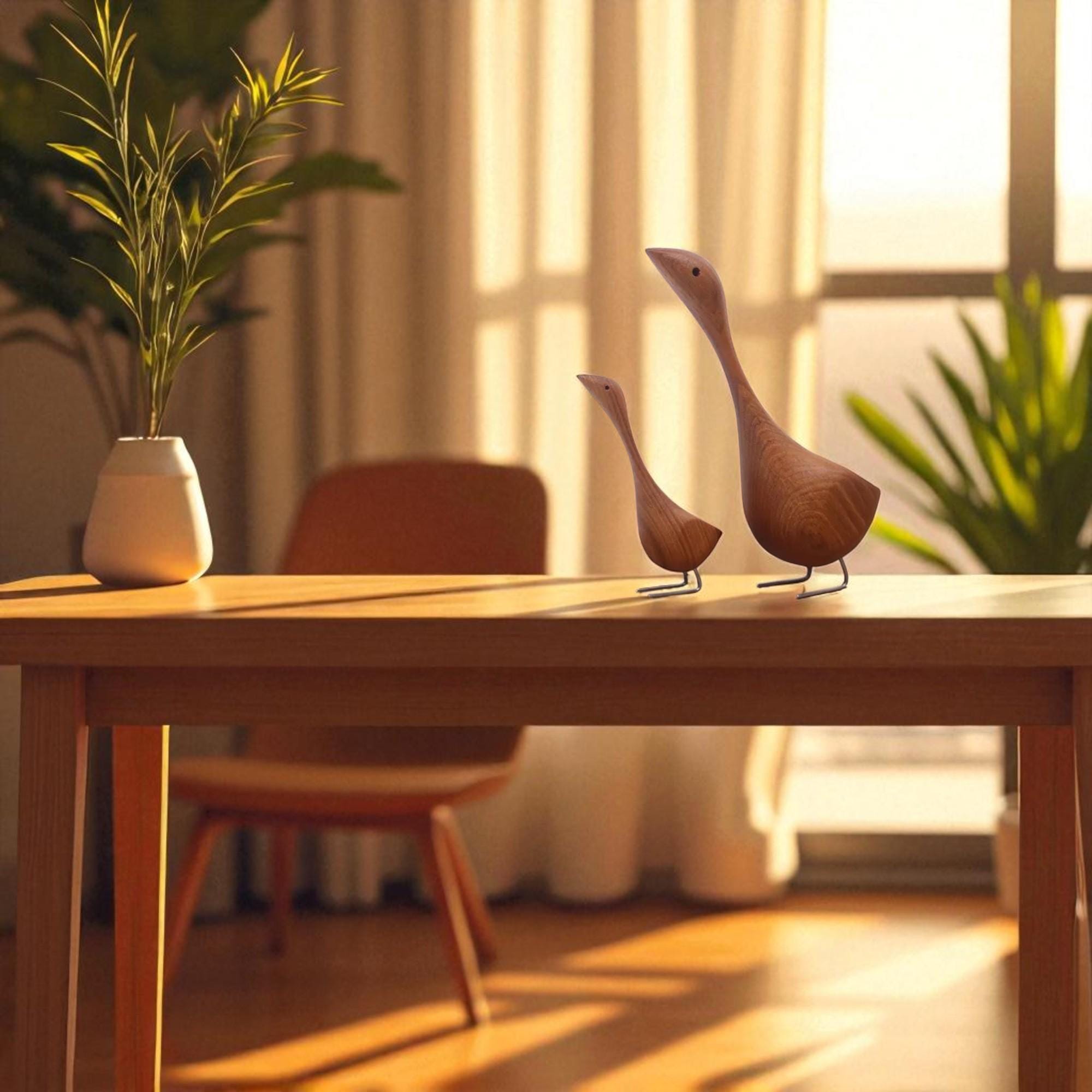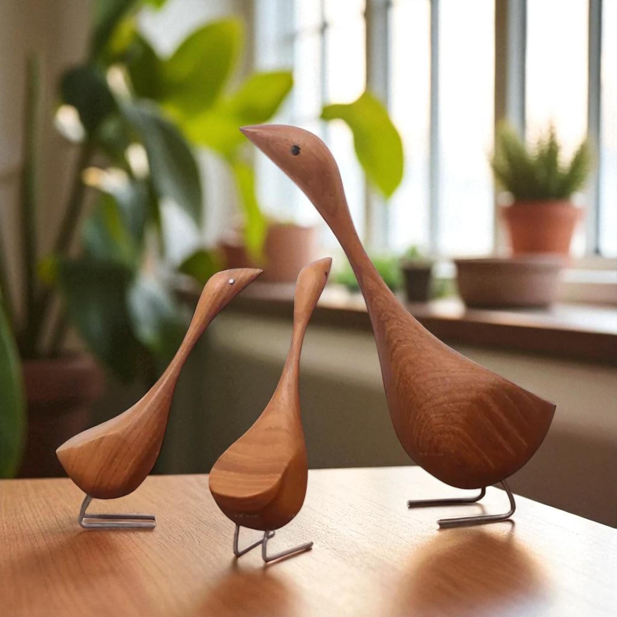 Handcrafted Teak Wooden Goose Sculpture Set – Scandinavian Minimalist Bird Decor, Set of 2