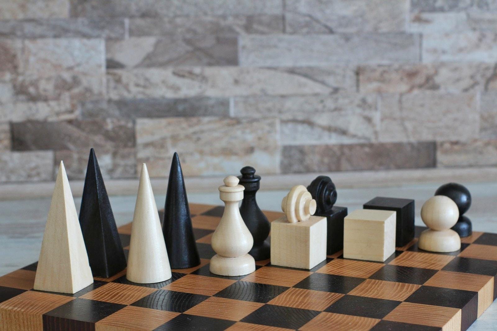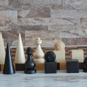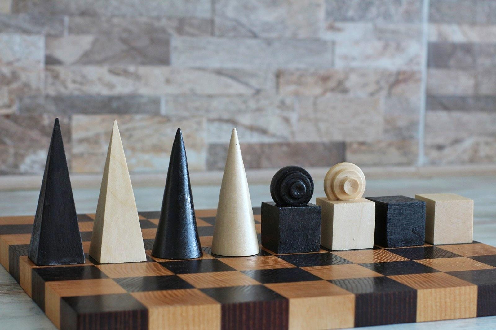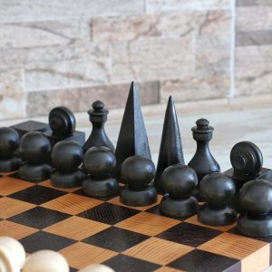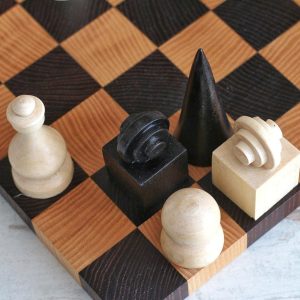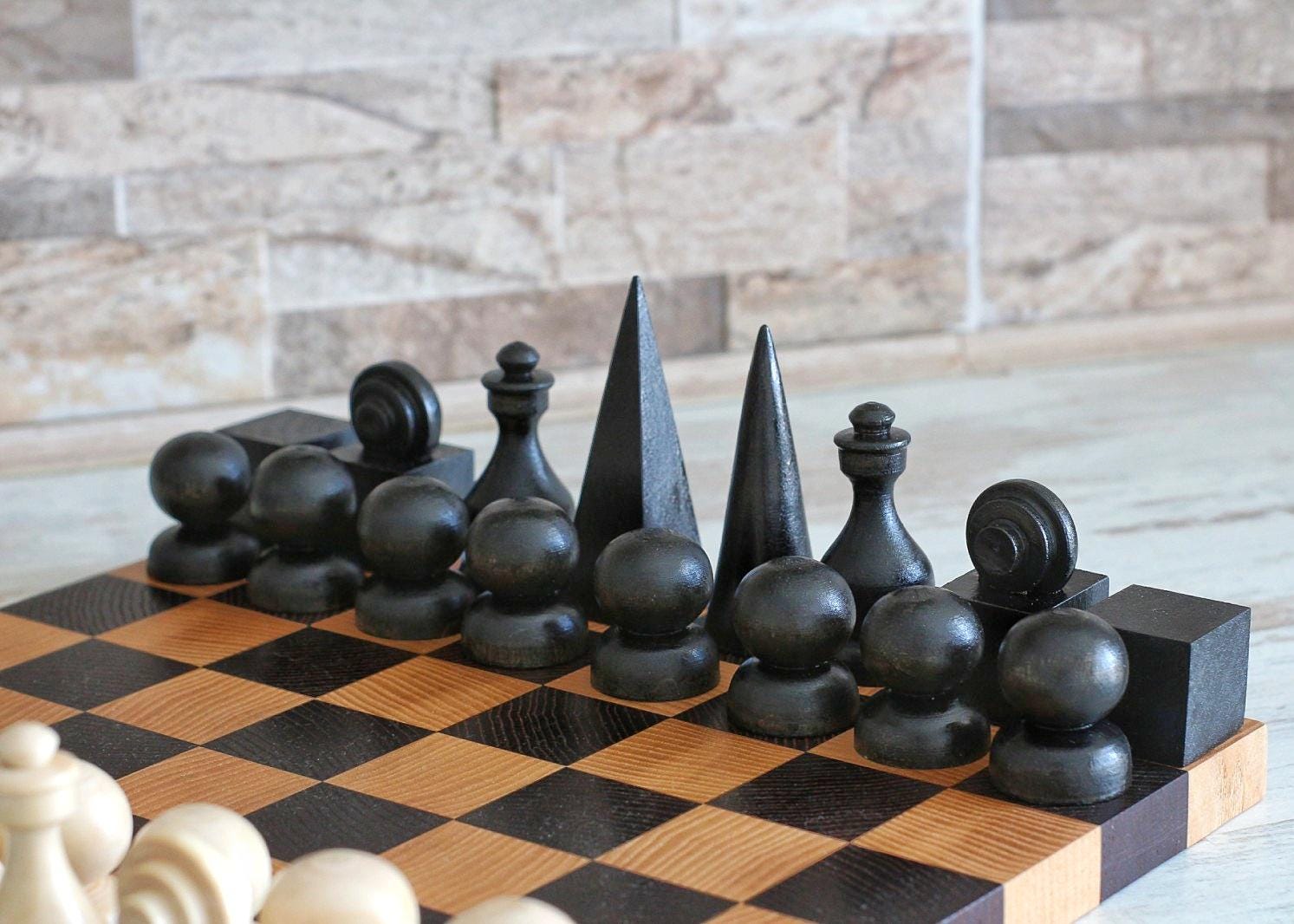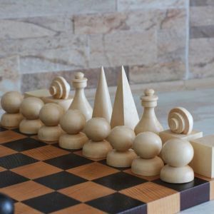A refined hand-carved chess set inspired by the principles of Bauhaus design — clean geometric forms, functional beauty, and premium materials. Crafted from high-quality solid walnut, this set is both a functional game set and a work of art.