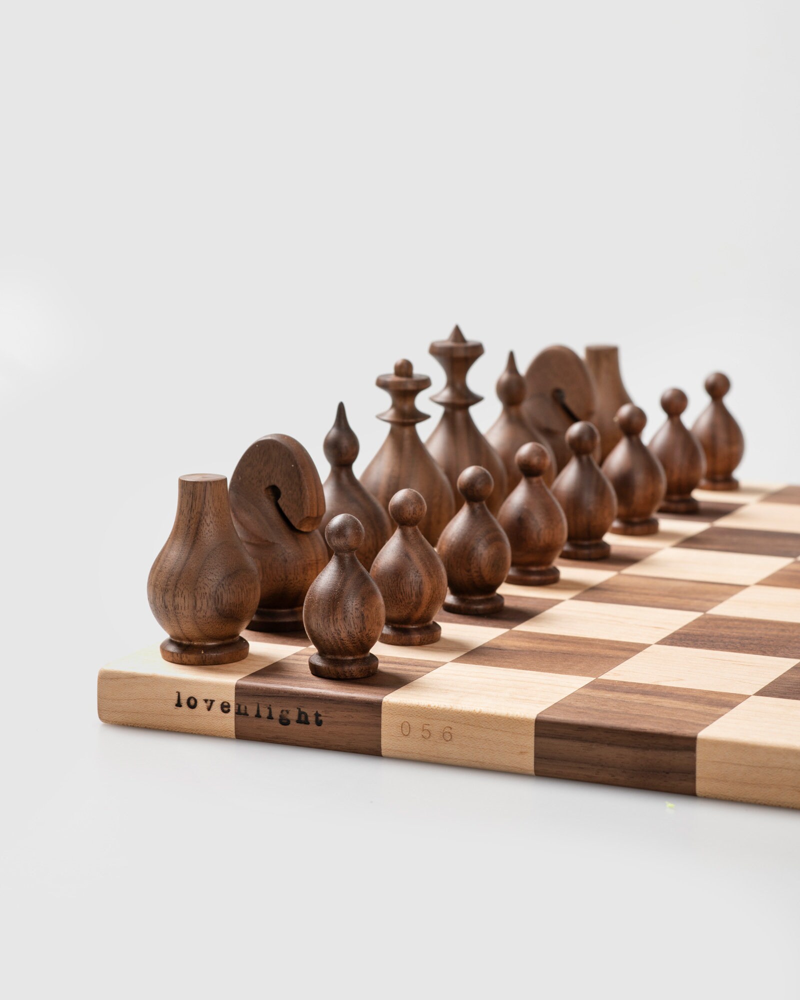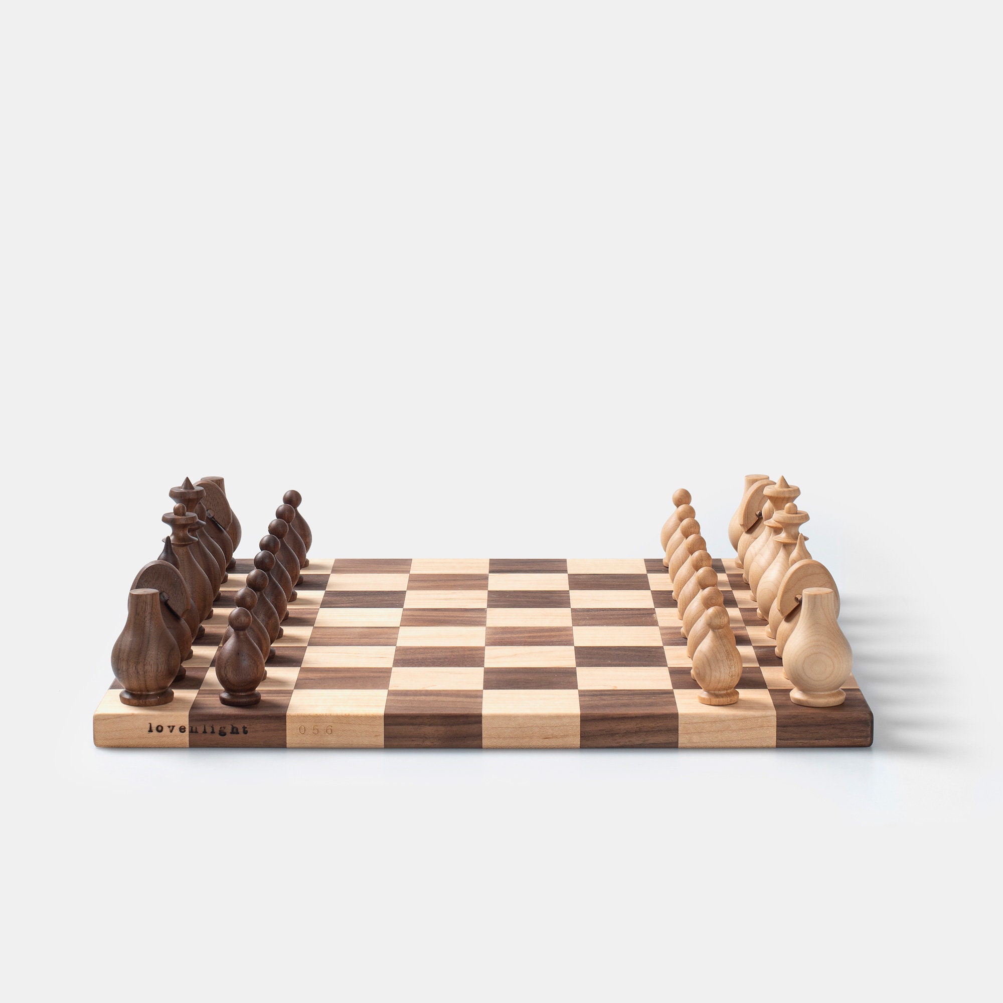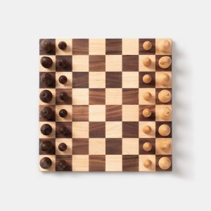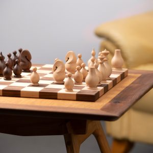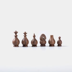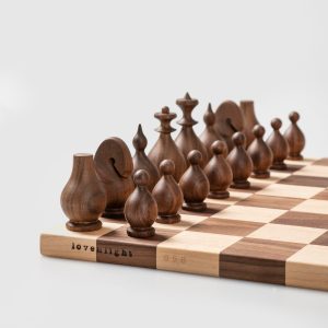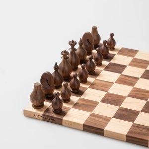 A signature handcrafted chess set in solid walnut and ash, designed with passion for the game and love for fine woodworking. This original design piece delivers a smooth, satisfying playing experience while serving as a beautiful display item.