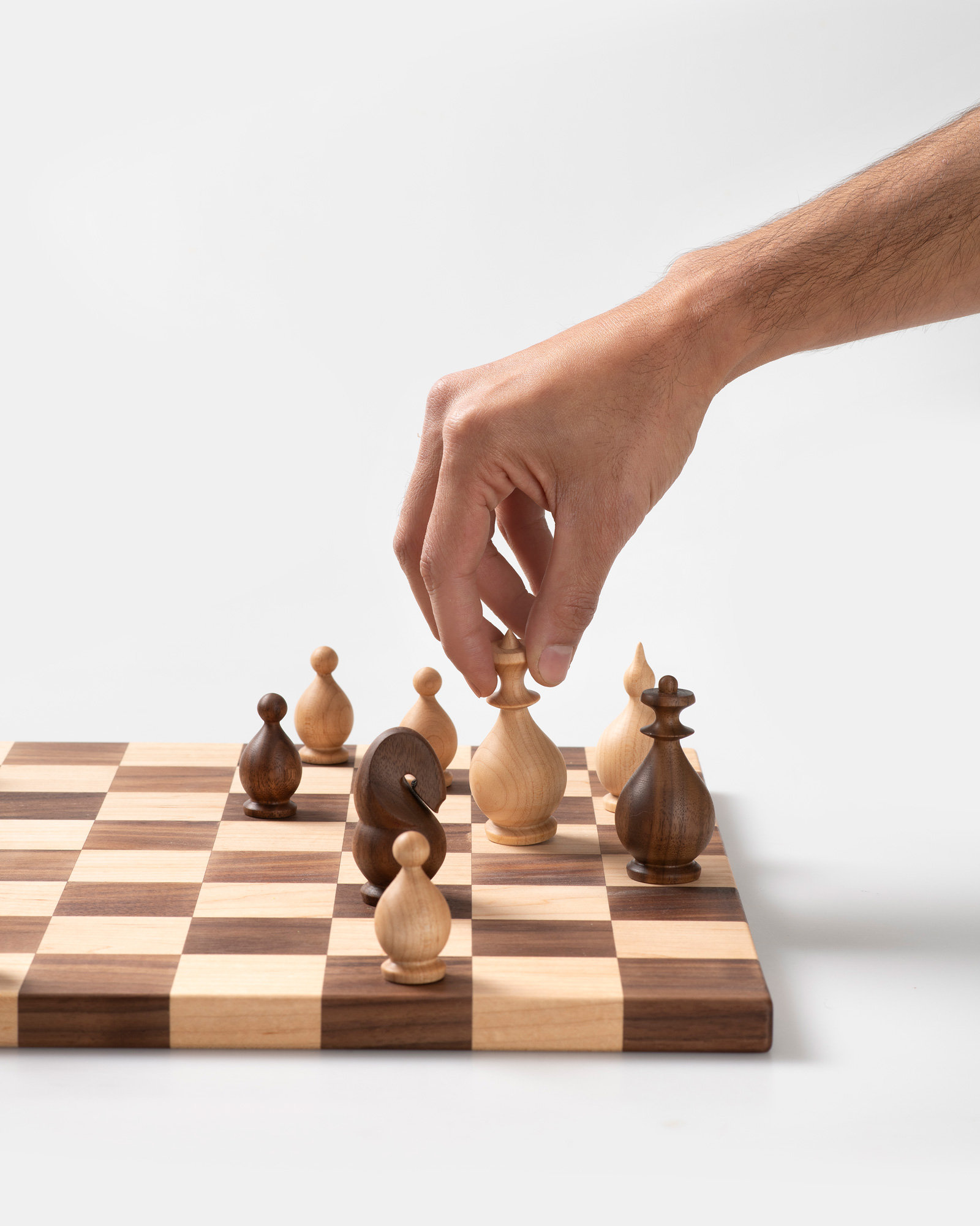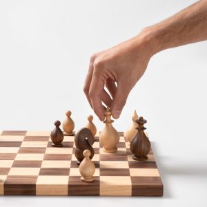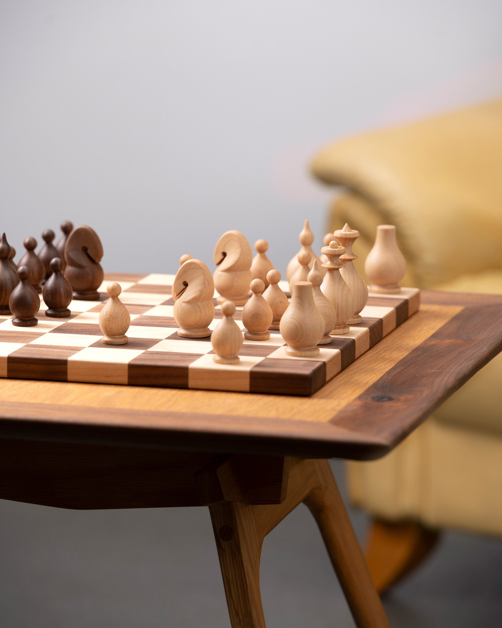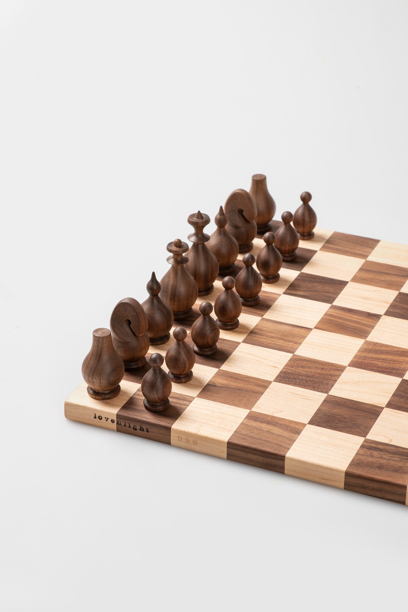 A signature handcrafted chess set in solid walnut and ash, designed with passion for the game and love for fine woodworking. This original design piece delivers a smooth, satisfying playing experience while serving as a beautiful display item.