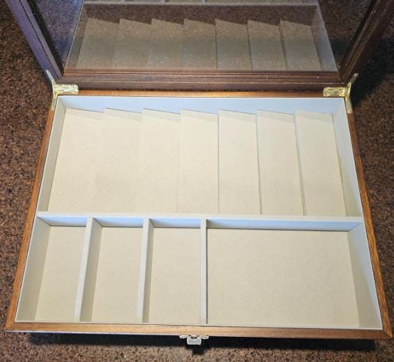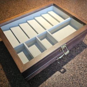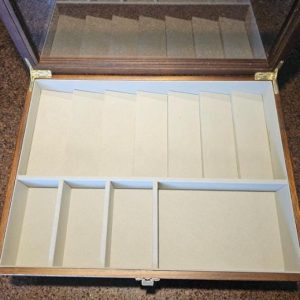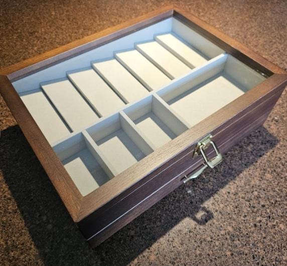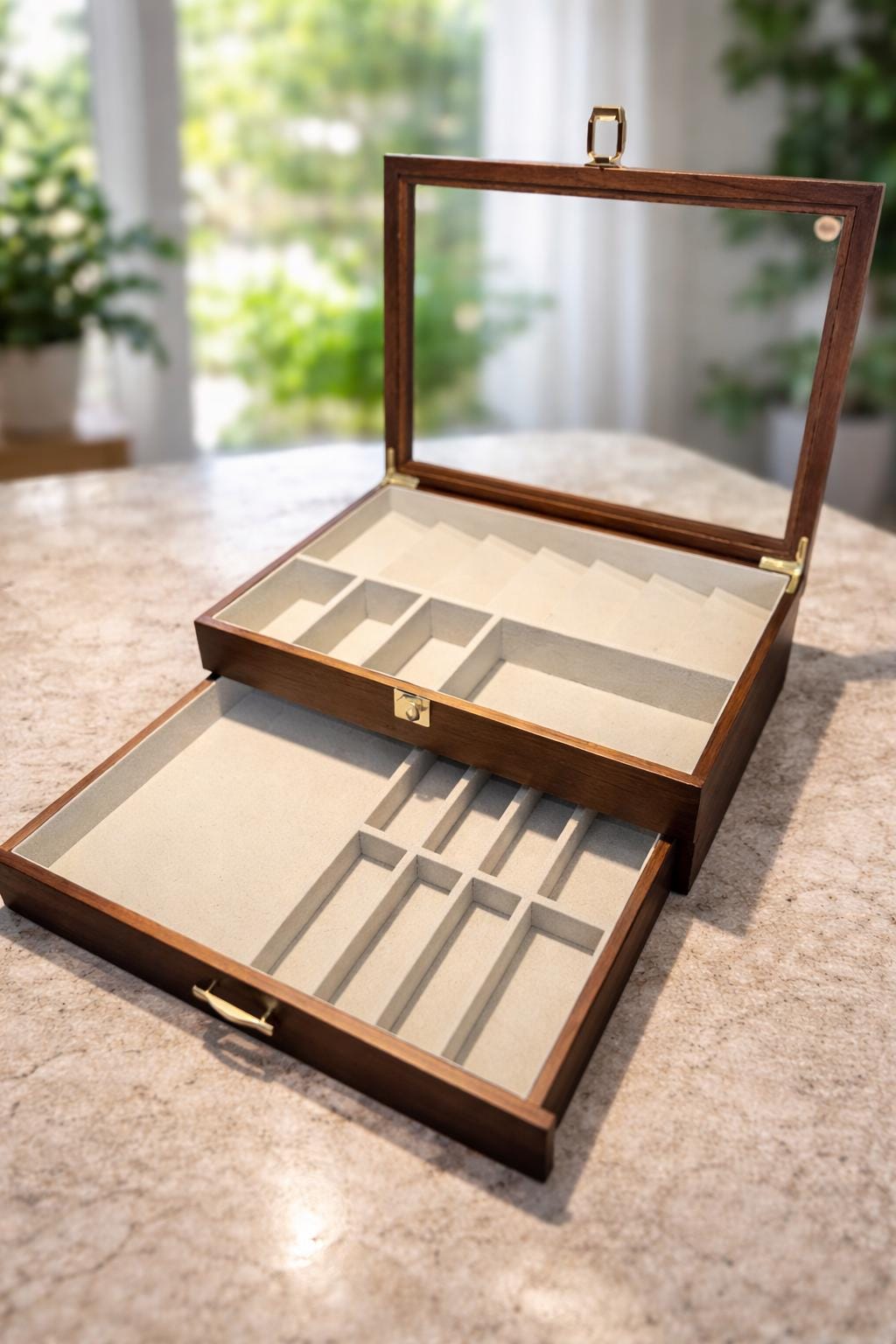 Showcase and preserve your folding knife collection with this elegant wooden display case, designed for collectors who value both presentation and protection. The clear glass lid allows full visibility while keeping items dust-free and protected.