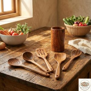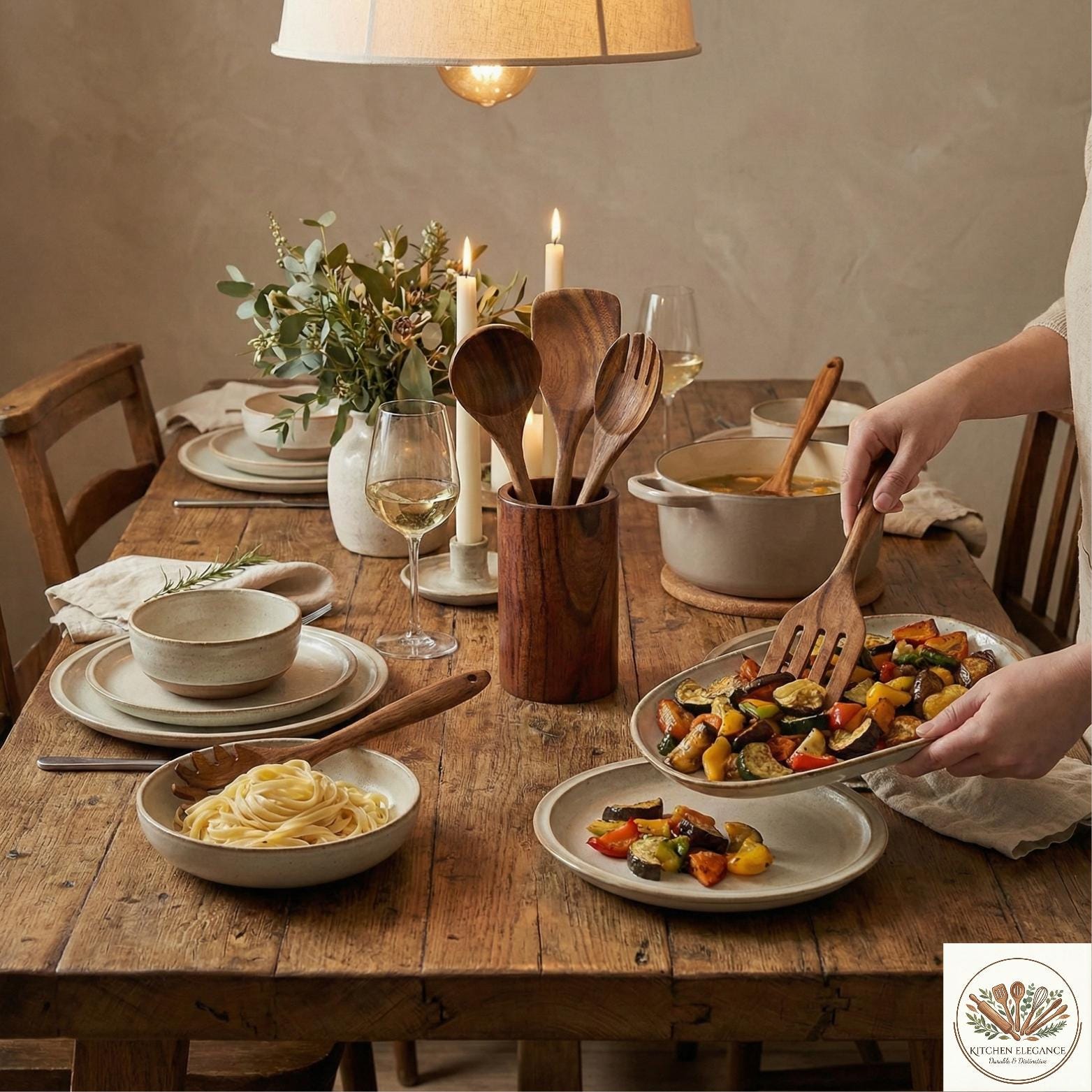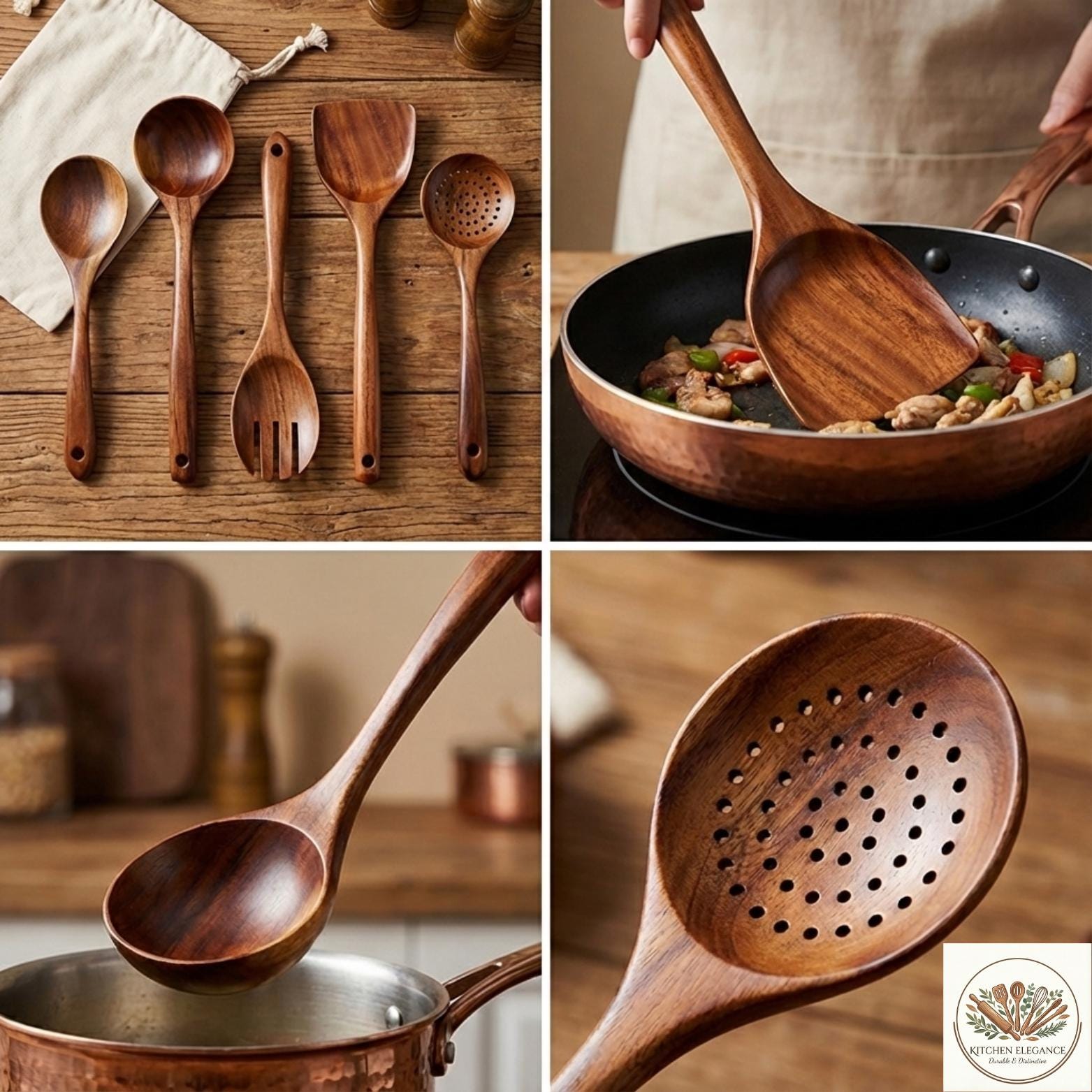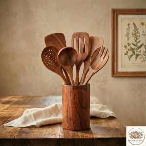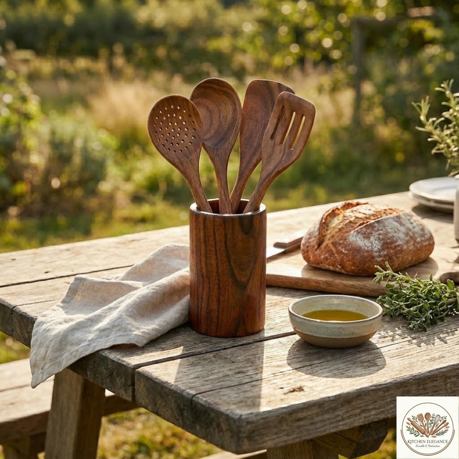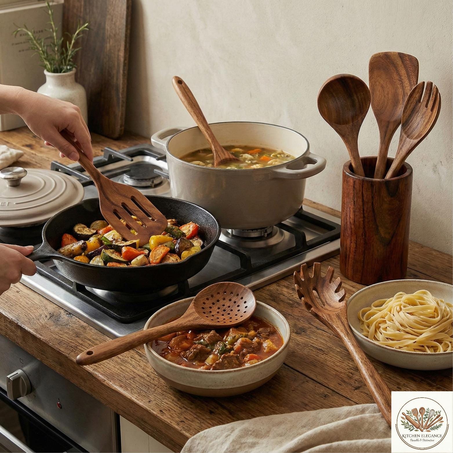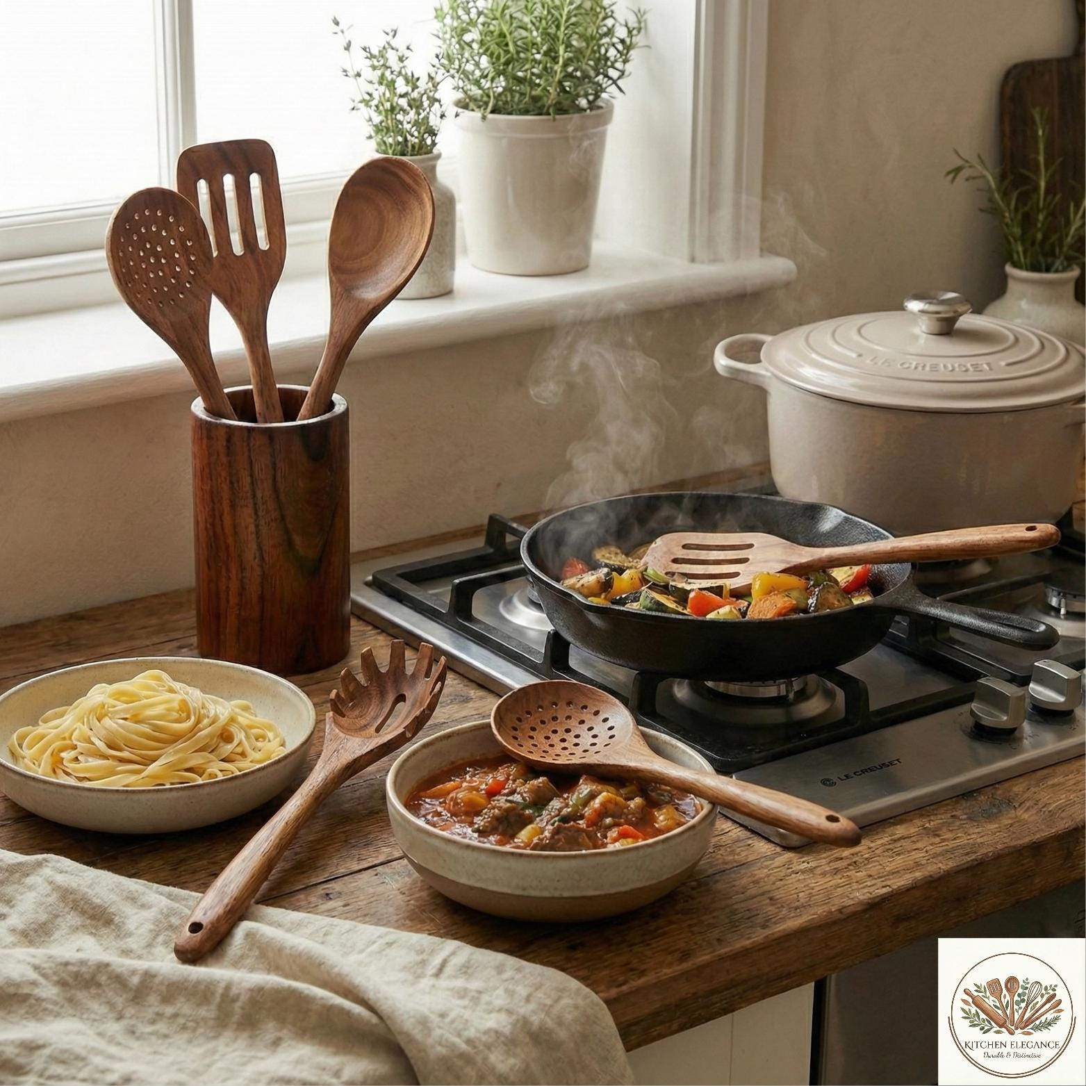 Upgrade your kitchen with this 6-piece wooden kitchen utensil set, designed to combine practical function, natural aesthetics, and lasting durability. Each tool is crafted from quality natural wood with a smooth finish that is gentle on cookware surfaces.